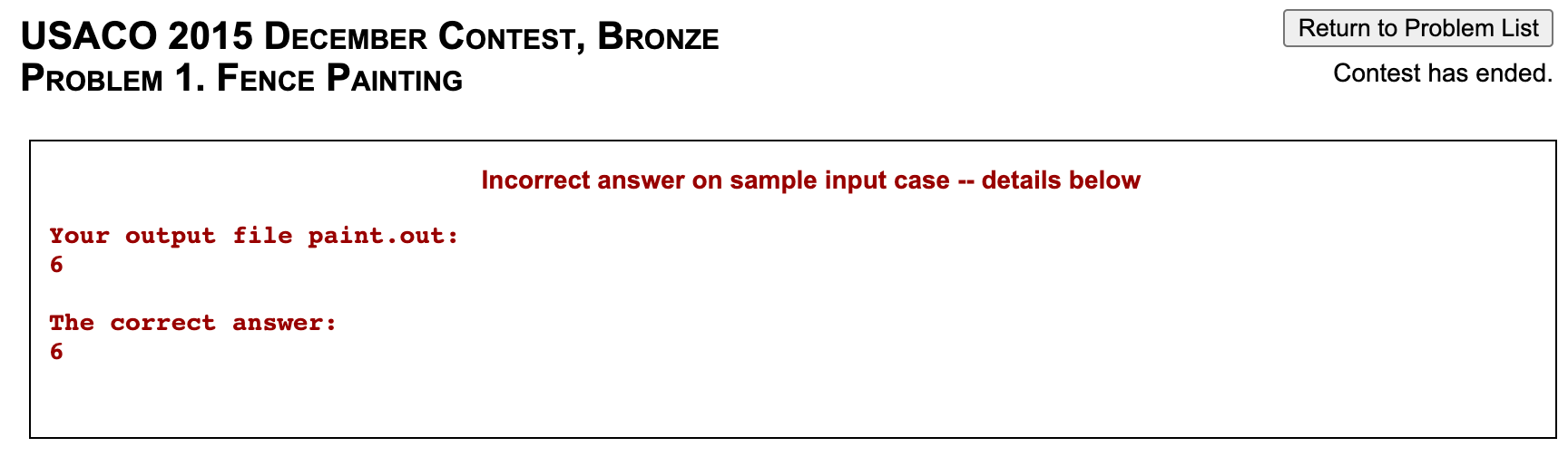 - Submit your solution. For CSES, you will be redirected to the results page (for USACO, results will appear at the top of the page). If your solution is correct on all the test cases, you're done! Otherwise, fix your code and start again from step 1.