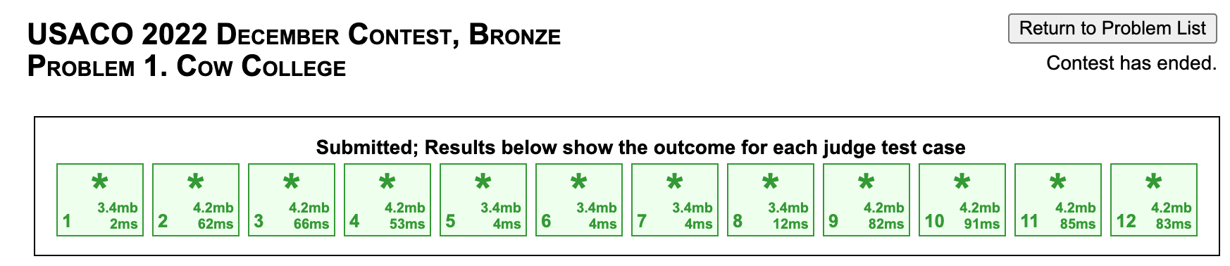 For example, Cow College has 1 sample test case (test case 1) and 11 non-sample test cases (test cases 2-12). For each of test cases 2-12 you get correct, you earn points.